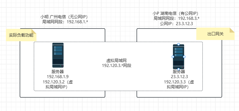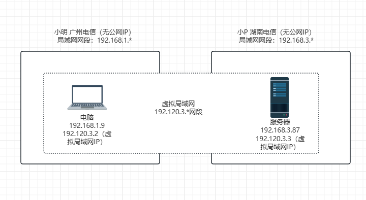 在无公网IP的情况下,需要在广域网使用,比较推荐的方式是使用虚拟局域网的方式进行,示意如下: